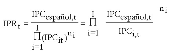 Donde, IPR representa el índice de precios relativos, t son los años, i los países para los que se calcula el índice, y n la ponderación de dichos países. De esta forma, un aumento (disminución) del IPR expresará una pérdida de competitividad de España frente a la zona seleccionada, debido a un crecimiento de sus precios superior al de sus competidores, o a una menor contención de los mismos frente a la zona elegida.