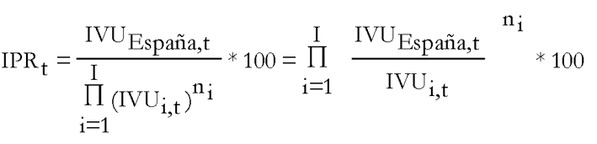 Donde IPR expresa el índice de precios relativo en el año t; IVUEspaña,t son los índices de valor unitario de España en el año t, i son los países que componen el área de referencia cada uno de ellos ponderado según el cuadro mostrado anteriormente.