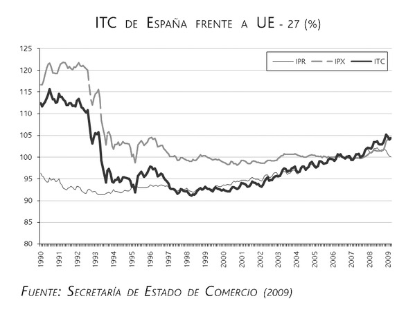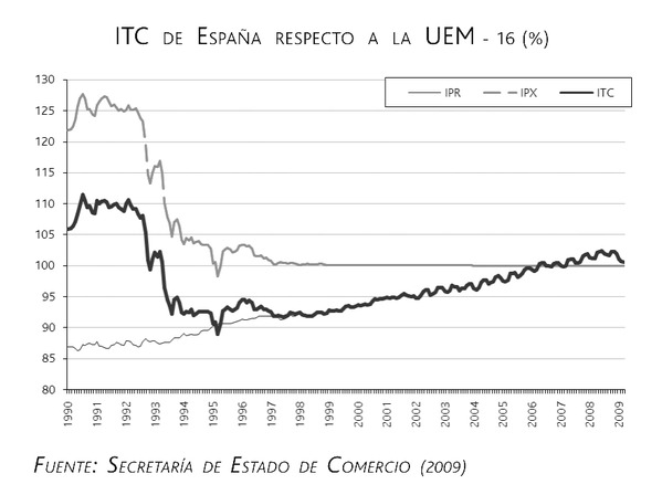 Analizando los gráficos siguientes podemos comprobar la evolución del ITC de España respecto a la UE-27 y respecto a la UEM-16. En ambos casos se puede comprobar cómo la evolución del ITC ha seguido dos trayectorias claramente diferenciadas, una hasta 1995 y otra a partir de 1997. En la primera, desde 1990 hasta 1995, el ITC ha ido disminuyendo fundamentalmente como consecuencia de la pérdida de valor de la peseta, especialmente con las devaluaciones de 1992, la de 1993 y la de 1995, ya que aún manteniendo unos precios crecientes (aumento del IPR frente a los países europeos y de la zona euro) la depreciación/devaluación de la peseta más que compensó dicho crecimiento, permitiendo que mejorase la competitividad precio de nuestra economía haciendo que el ITC pasase de un valor del 112 y 106 % —medido frente a la UE-27 y UEM-16 respectivamente— a un valor cercano al 95 %, en ambos casos.