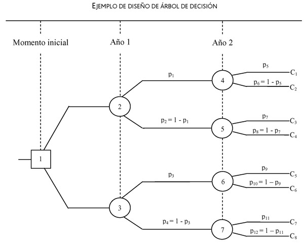 Para facilitar las explicaciones posteriores, así como la comprensión de las mismas, se ha optado por diseñar un árbol de decisión que presenta un nudo decisional, y seis nudos aleatorios, siendo el horizonte temporal para la realización del análisis de dos períodos.