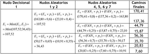 El cálculo de los valores esperados asociados a cada nudo se llevará a cabo empezando por lo más alejado en el tiempo, es decir, los que se encuentran en el período inmediatamente anterior al final del camino, y se irá retrocediendo hasta obtener el valor esperado del nudo 1, situado en la raíz del árbol, cuyo valor será el valor esperado del VAN que se corresponda con la mejor de las alternativas planteadas, y que, en principio, deberá ser la alternativa elegida.