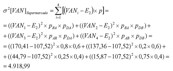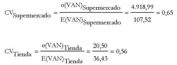 Así, mientras la alternativa de abrir un supermercado a las afueras de la ciudad tiene una desviación con respecto a su valor medio (medida por su desviación típica) de 4.918,99 euros, la alternativa de abrir una tienda de barrio en el centro de la ciudad tiene una dispersión de solo 420,33 euros.