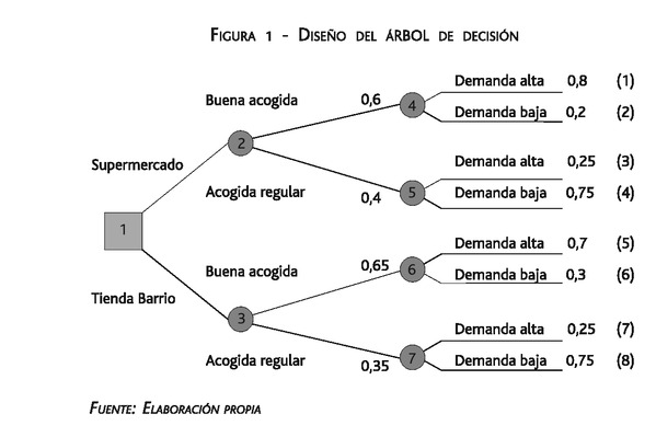Si se opta por abrir una tienda de barrio en el centro de la ciudad y la acogida de los clientes es buena, entonces se podrían obtener durante el primer año unos flujos netos de caja de 45.000 euros, mientras que si la acogida es regular los flujos netos de caja se reducirían a 25.000 euros. No obstante, durante el segundo año si la acogida del primer año fue buena, los flujos netos de caja podrían ascender a 55.000 euros, si la demanda es alta durante este período, o de 30.000 euros, si la demanda es baja. Mientras que si durante el primer año la acogida fue regular, si durante el segundo año la demanda es alta los flujos netos de caja podrían ascender a 34.000 euros, y a 18.000 euros, si la demanda es baja. La probabilidad de que la acogida sea favorable el primer año es del 65 %, mientras que la probabilidad de que la demanda sea alta el segundo año cuando la acogida del primer año ha sido favorable es del 70 %, y del 25 %, cuando la acogida del primer año fue regular. La inversión que debería llevar a cabo la empresa para la puesta en marcha de la tienda de barrio asciende a 30.000 euros.