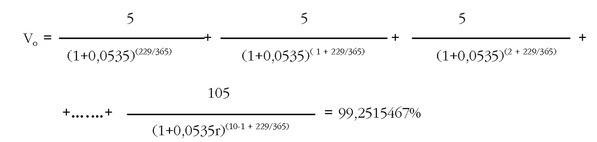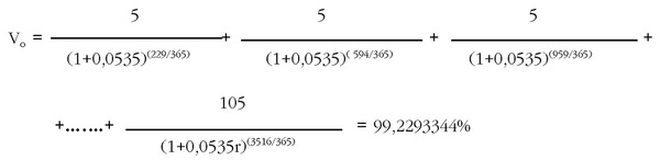 Si queremos calcular el valor actual o precio del bono que habíamos puesto en el ejemplo anterior, pero usando la base A/365, tendríamos:
