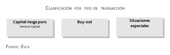 Al igual que en los hedge funds, no existe una clasificación universalmente aceptada del capital riesgo. La EVCA (European Private Equity & Venture Capital) ha propuesto dos clasificaciones atendiendo al tipo de transacción y a la madurez de la compañía.