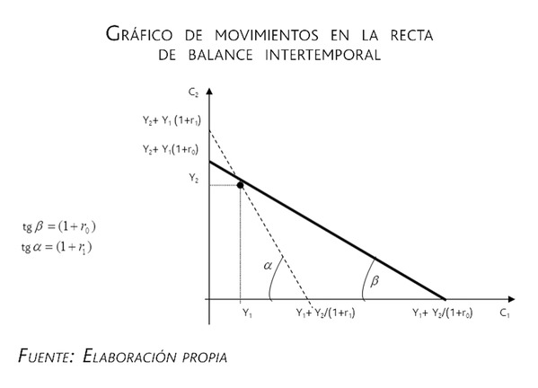 Supongamos r2> r1, en este caso variará la pendiente, variarán los puntos de corte con los ejes, pero no variarán lógicamente las disponibilidades de renta del individuo (Y1, Y2).