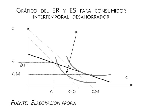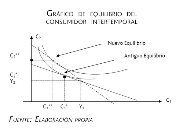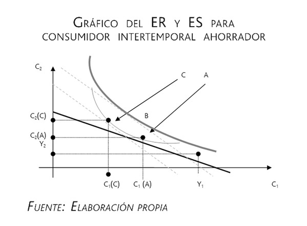 ¿Qué explicación económica tiene lo que ha sucedido, es decir, que ante un incremento de r el consumidor ahorrador aumente o disminuya C1? Por un lado, el consumidor aumentará C1 ya que al elevarse r, ahora puede ahorrar lo mismo para el mañana viviendo un poco mejor en el presente, pero también puede verse tentado de reducir C1, ya que ahora al elevarse el interés que se paga el consumo presente está penado sobre el consumo futuro (o el ahorro primado): ahora es más interesante incluso que antes el acto de ahorrar. En suma, no está totalmente claro que va a suceder en el presente con el consumo si se elevan los tipos de interés, lo cual tiene, obviamente, importantes consecuencias macroeconómicas.