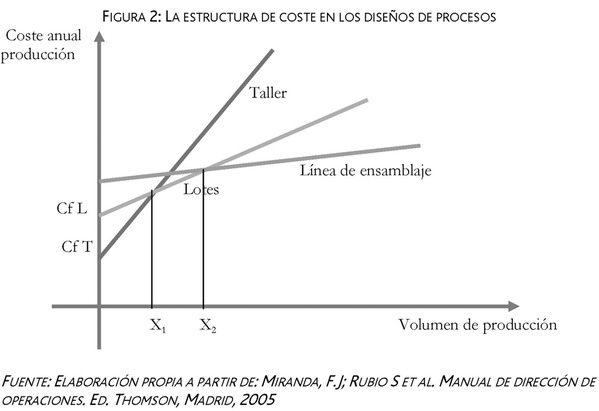 Así, para un volumen de producción inferior a X1, la mejor alternativa sería un diseño de procesos por talleres de trabajo. En un volumen de producción comprendido entre X1 y X2, la empresa optaría por un diseño de fabricación por lotes. Y para un volumen de producción superior a X2, sería interesante un diseño de procesos por línea de ensamblaje.
