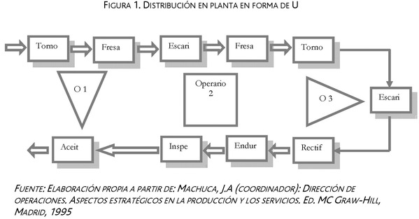 La filosofía “Justo a Tiempo” (JIT), intenta evitar en sus plantas de producción las organizaciones por procesos con talleres que agrupan las máquinas de igual función. Este tipo de organización caracterizado por una fabricación bajo pedido no repetitiva, con complejos procesos productivos, fabricación por lotes y que intenta evitar todo tipo de despilfarros y por ello busca la flexibilidad en el número de trabajadores de una determinada línea para adaptarse a los cambios de la demanda, requiere de una distribución de la planta muy concreta siendo la que más se ajusta a esta filosofía la Distribución en Planta en forma de U, cuya principal característica es que los puestos de entrada y salida de la línea se encuentran en paralelo y normalmente manejados por el mismo operario (ver figura 1).