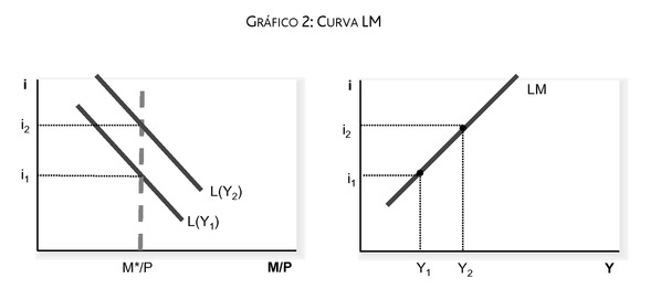 En el Gráfico 2 se recoge el equilibrio del mercado de dinero y la obtención de la curva LM de acuerdo con este razonamiento.