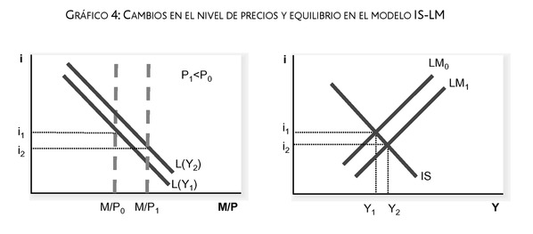 Si se parte de una situación de equilibrio en el modelo IS-LM y, por ejemplo, disminuyen los precios, el resultado será un aumento de la oferta monetaria en términos reales (Gráfico 4). En el mercado de dinero, esto supone que para que se mantenga el equilibrio —con el mismo nivel de renta— es necesario que el tipo de interés se reduzca. La curva LM se estará desplazando hacia la derecha.