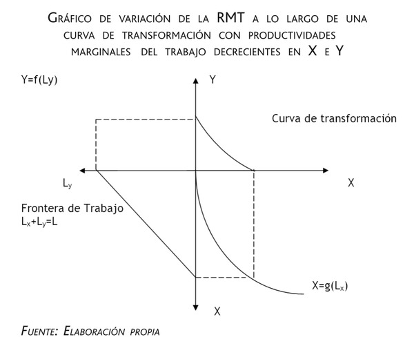 Obsérvese que, desplazarnos de un punto A de la Curva de Transformación a otro B, implica reasignar recursos desde A hasta B en cada función de producción de X e Y. Si las productividades marginales del trabajo en la producción de los bienes X e Y es decreciente, al aumentar la cantidad producida de X y disminuir la de Y deberá aumentar la RMTYX.