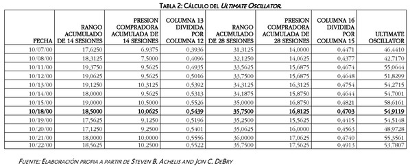 - - La última columna, la octava, corresponde al ULTIMATE OSCILLATOR. Aplicando la expresión del cuadro 1, obtendríamos lo siguiente: 4 * (0,5714) + 2 * (0,5439, columna quince) + 0,4703 (columna decimonovena) = 54,9119.