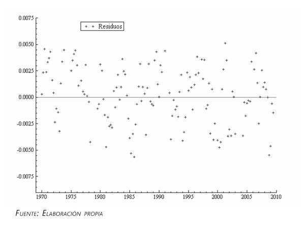 a) Los residuos obtenidos utilizando mínimos cuadrados ordinarios tienen que estar distribuidos de forma aleatoria para que este método de estimación funcione de forma adecuada. Por ejemplo, los residuos obtenidos para datos trimestrales del consumo utilizando mínimos cuadrados ordinarios serían: