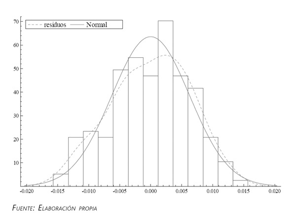 - • Si se supone que las perturbaciones del modelo siguen una distribución Normal, entonces los residuos no pueden ser asimétricos ni tampoco leptocúrticos o platicúrticos.