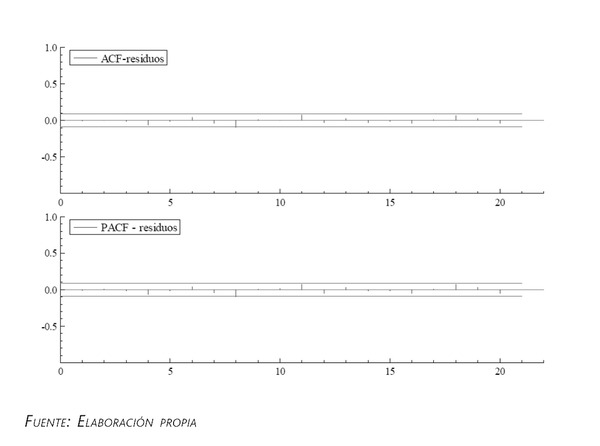 c) Se pueden utilizar para detectar problemas de autocorrelación o de heterocedasticidad, puesto que si el modelo está estimado correctamente, entonces los residuos deberían de ser ruido blanco, es decir, su media debería ser constante e igual a cero, su varianza también tiene que ser constante (no existe heterocedasticidad) y no deben estar correlacionados (no existe autocorrelación). Por ejemplo, para saber si existe o no autocorrelación en los residuos se pueden analizar sus funciones de autocorrelación simple (ACF) y parcial (PACF) estimadas. En el ejemplo siguiente se muestran estos gráficos para unos residuos en los que no existe autocorrelación: